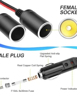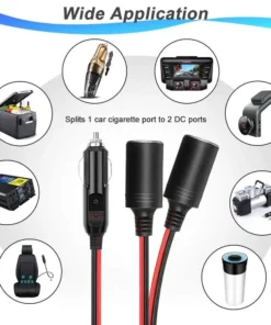 * Car cigarette extension cord split one cigarette lighter male plug into dual female DC ports sockets. It allows you to connect two 12V devices at the same time. Length: 60cm/23.6″.