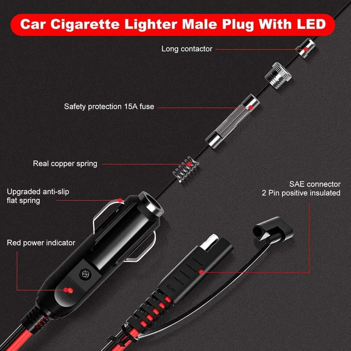 Premium Quality – Cigarette lighter SAE battery extension cable built-in upgraded anti-slip flat spring power plug, red power indicator, real copper spring, safety protection 15A fuse, quality long contactor