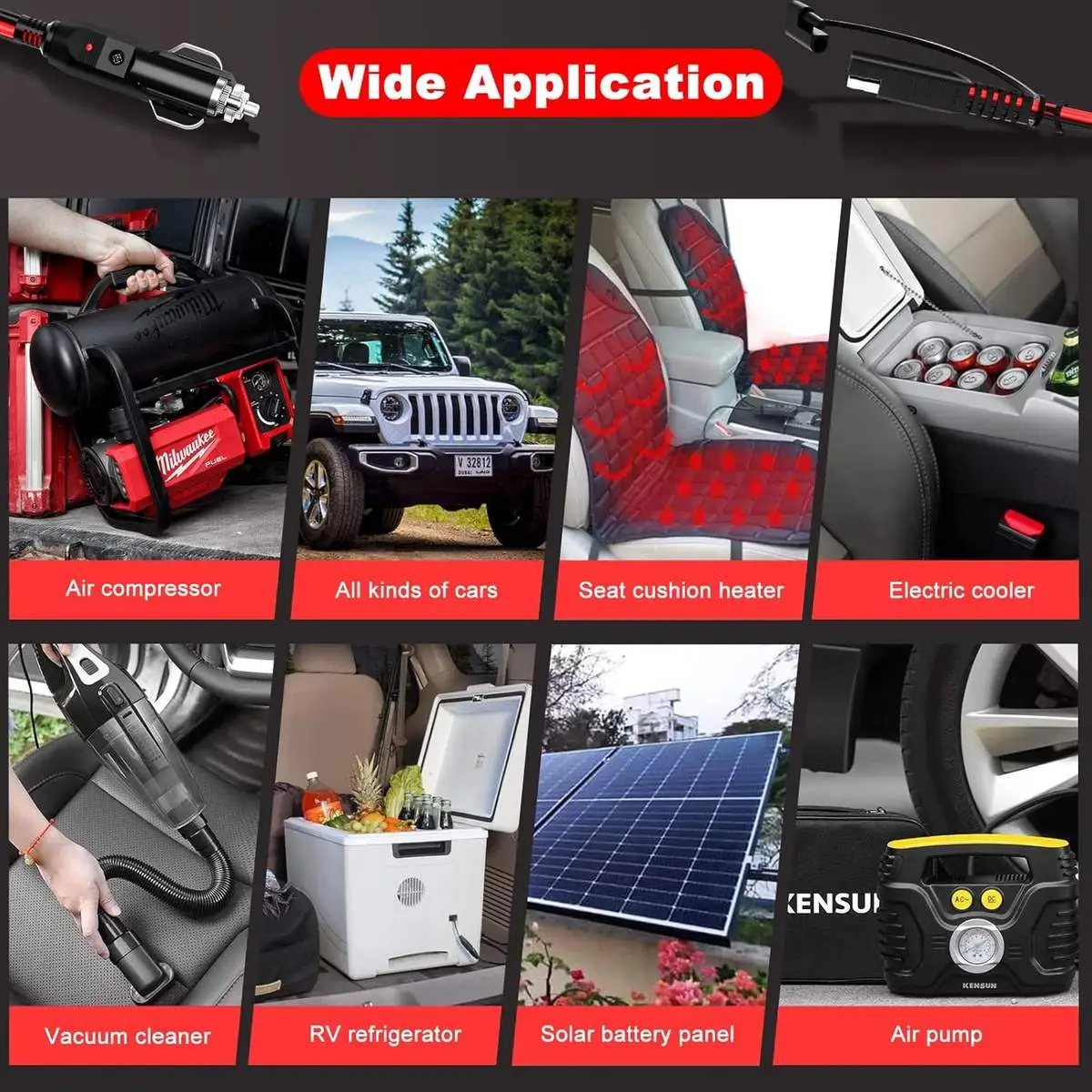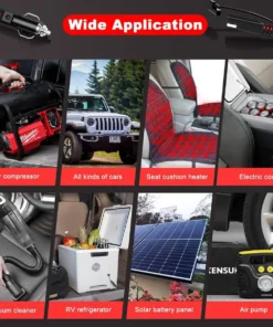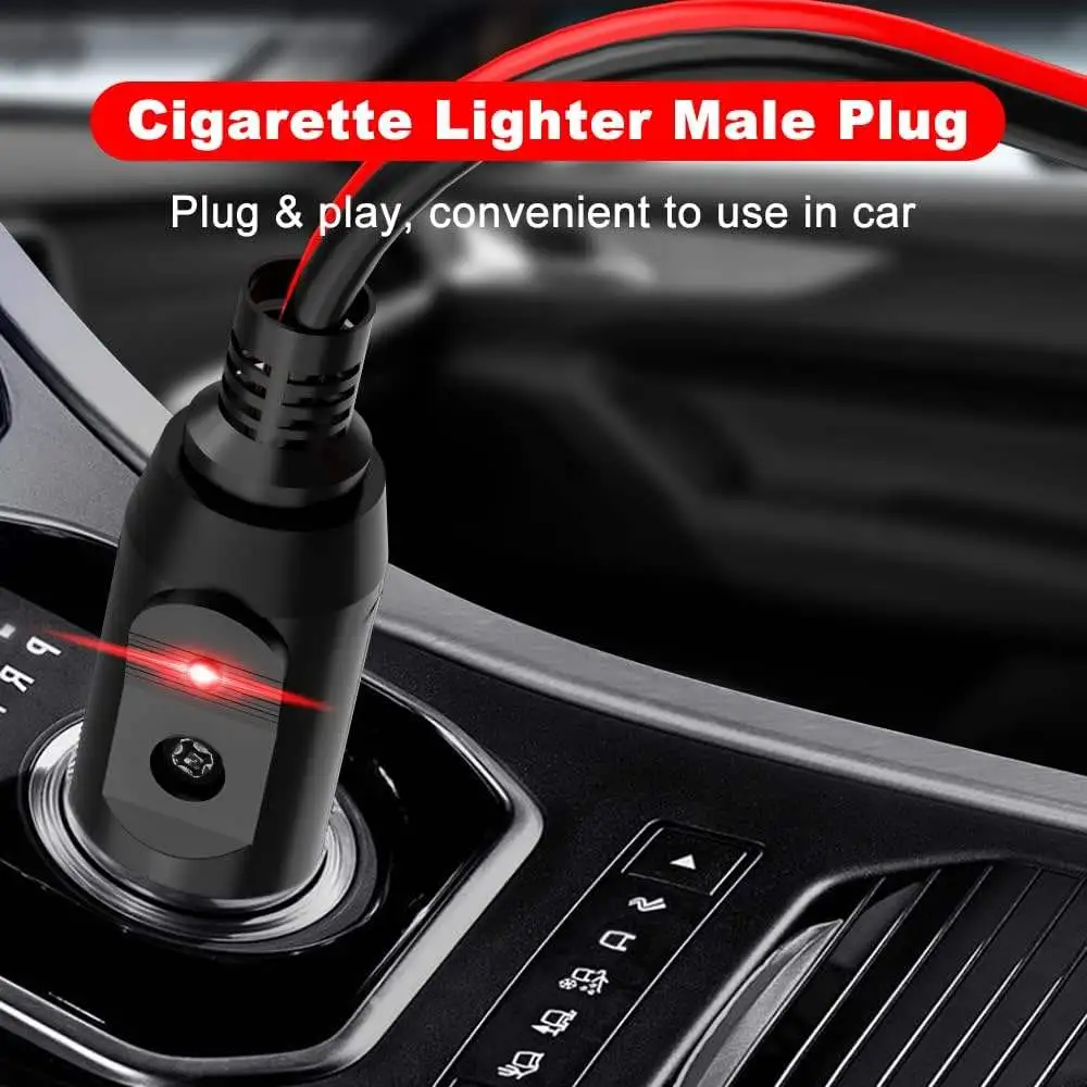 * Wide Applications – The cigarette lighter plug can be used for all kinds of cigarette lighter sockets on DC 12V/24V vehicles. Widely used in a seat cushion heater, air compressor, electric cooler, vacuum cleaner, air pump, RV refrigerator, car TV, solar battery