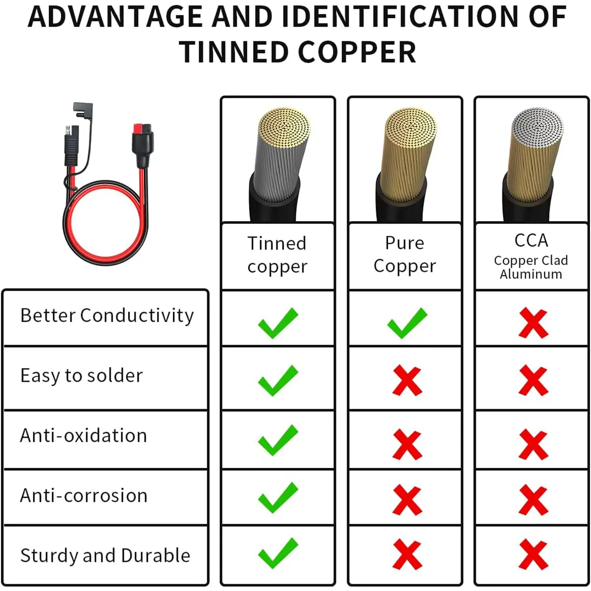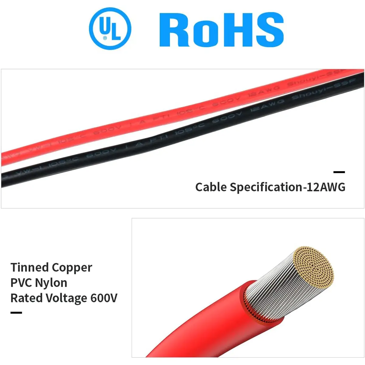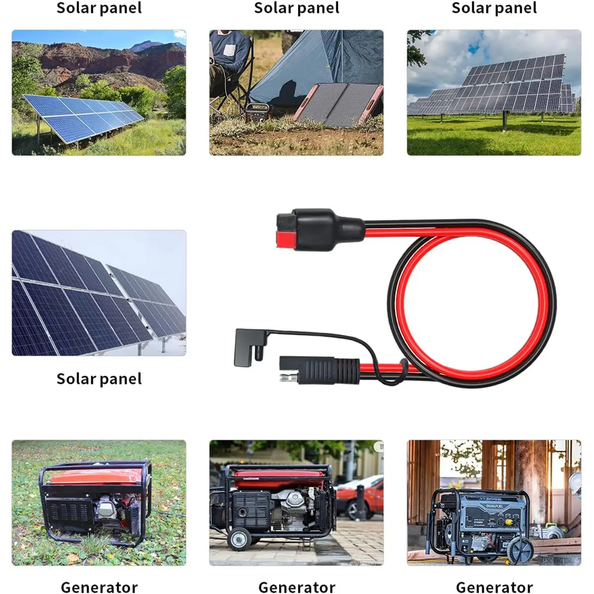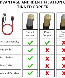 1. SAE to Anderson Adapter: This solar panel cable uses 12 AWG Tinned Copper Wire with High Quality Soft Silicone Material. Rated voltage is 600V. Heat Resistance 105℃. Solderability, Waterproof. It can reduce power loss and provide stable current to your equipment.