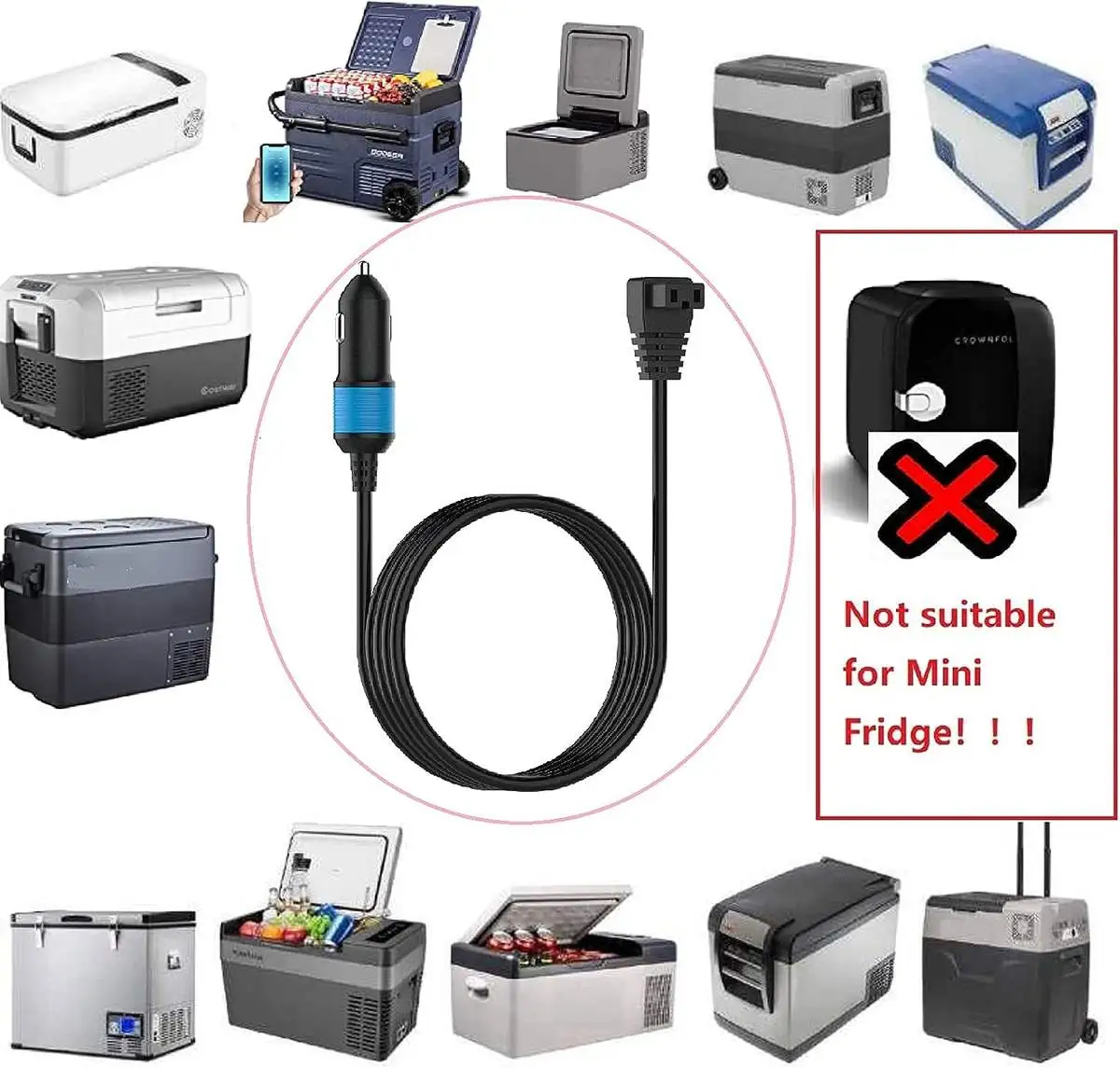 4. Noticed: This Power is not used for all Car Fridge and Car Cooler. Before Purchasing, Please Confirm whether it Conforms to your Refrigerator Power Socket. DO NOT USE MINI FRIDGE