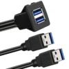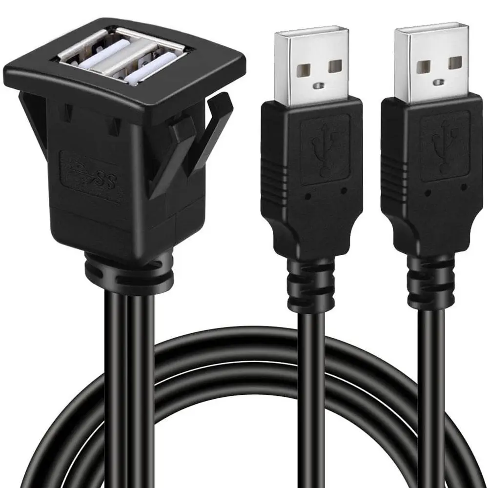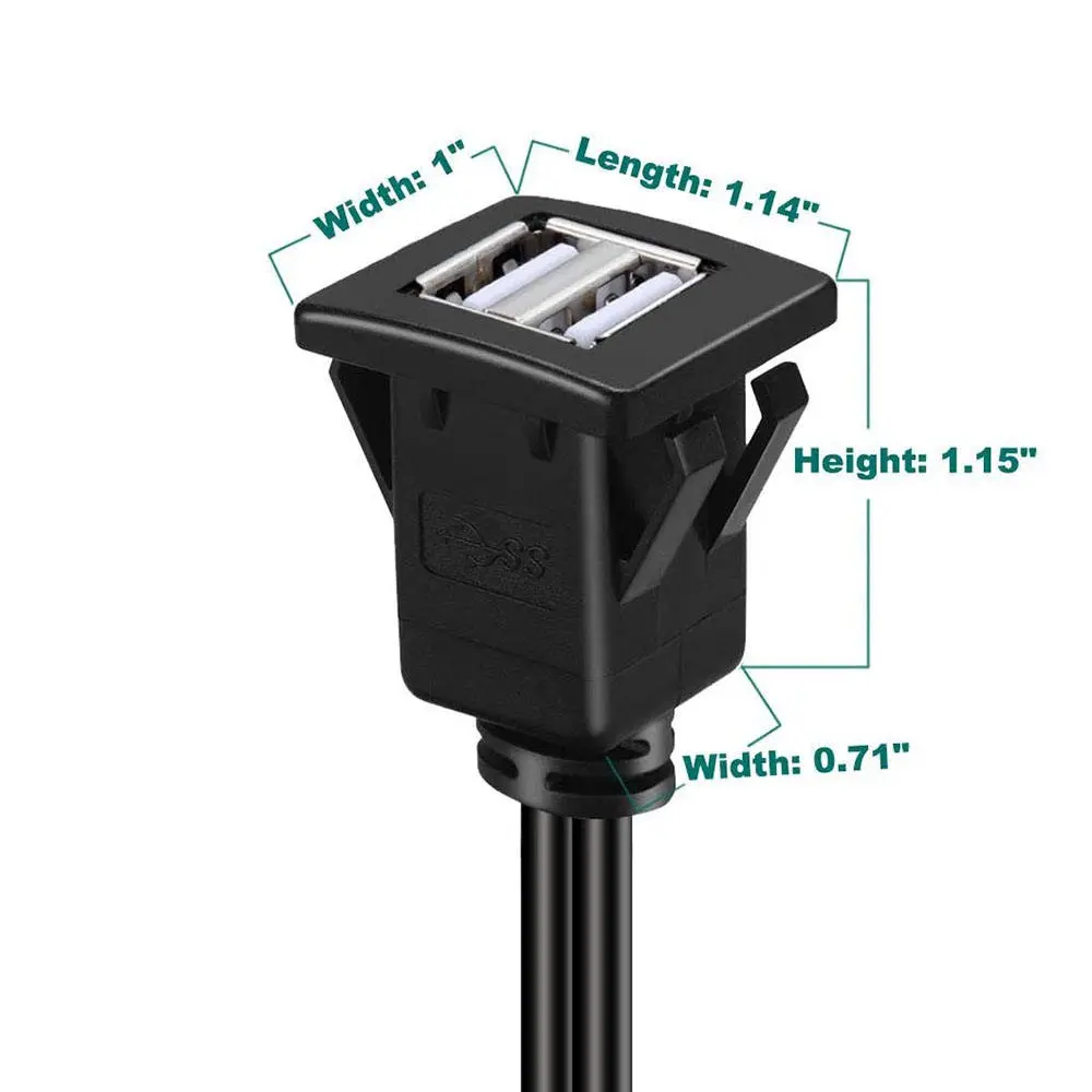 Dual Ports Square USB 2.0 Panel Flush Mount Extension Cable with Buckle for Car Truck Boat Motorcycle Dashboard