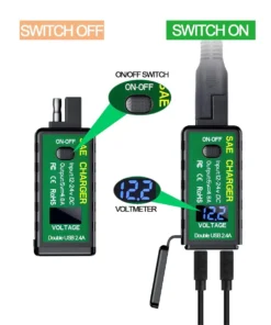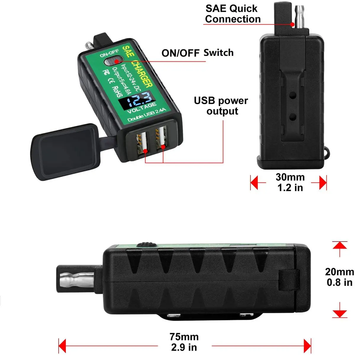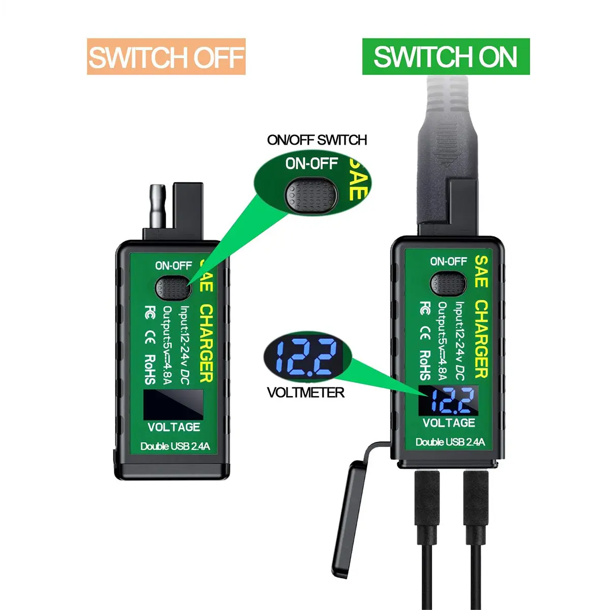 Motorcycle Phone Charger 4.8A With Voltmeter ON/Off Switch, SAE to Dual USB Adapter Waterproof for Phone, Tablet, GPS