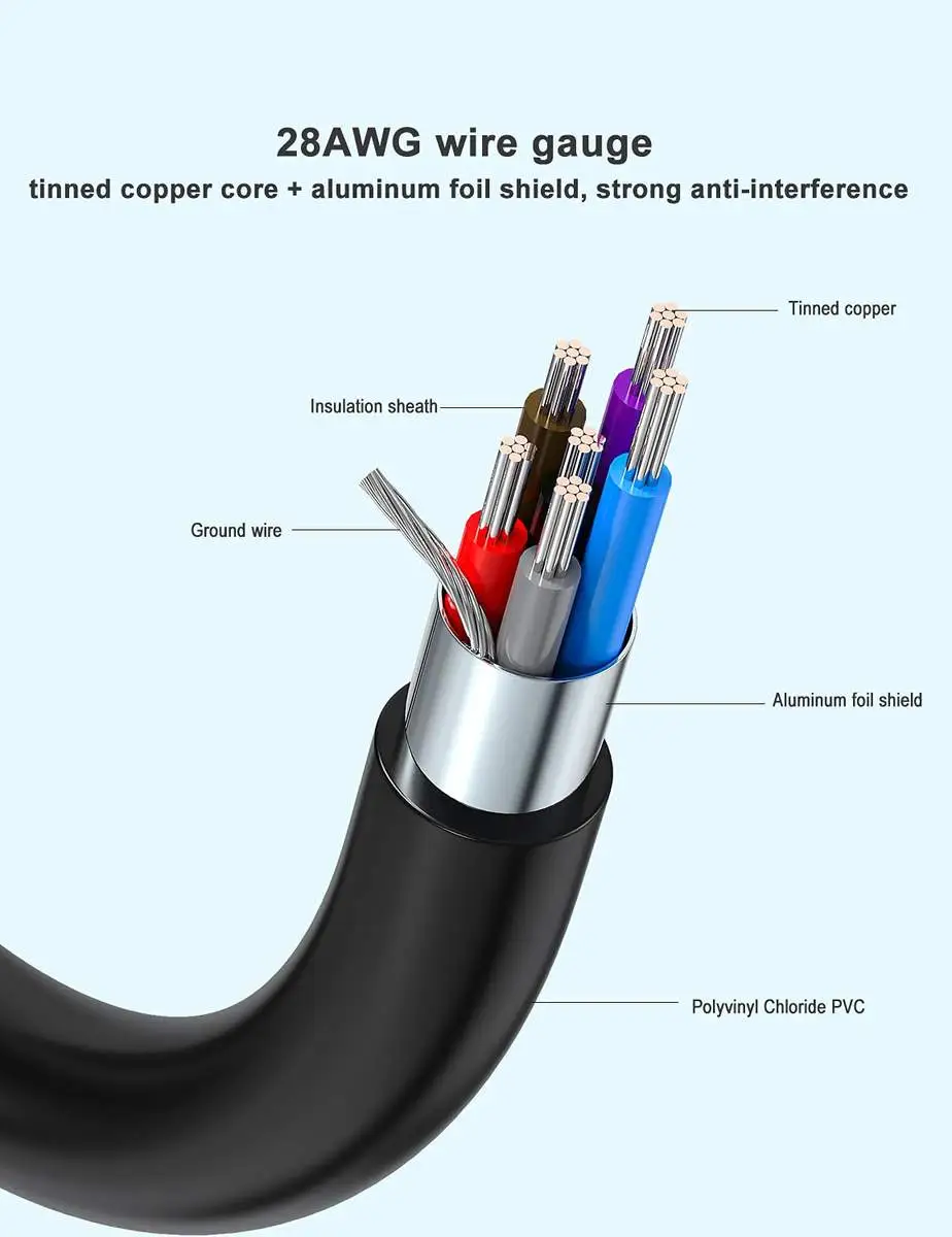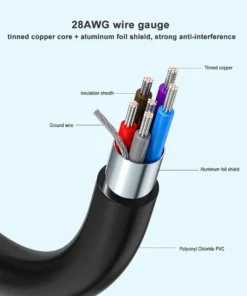 1. Conductor is used, 24/28AWG bare copper wire, aluminum foil attached body and ground wire. Reduce signal transmission