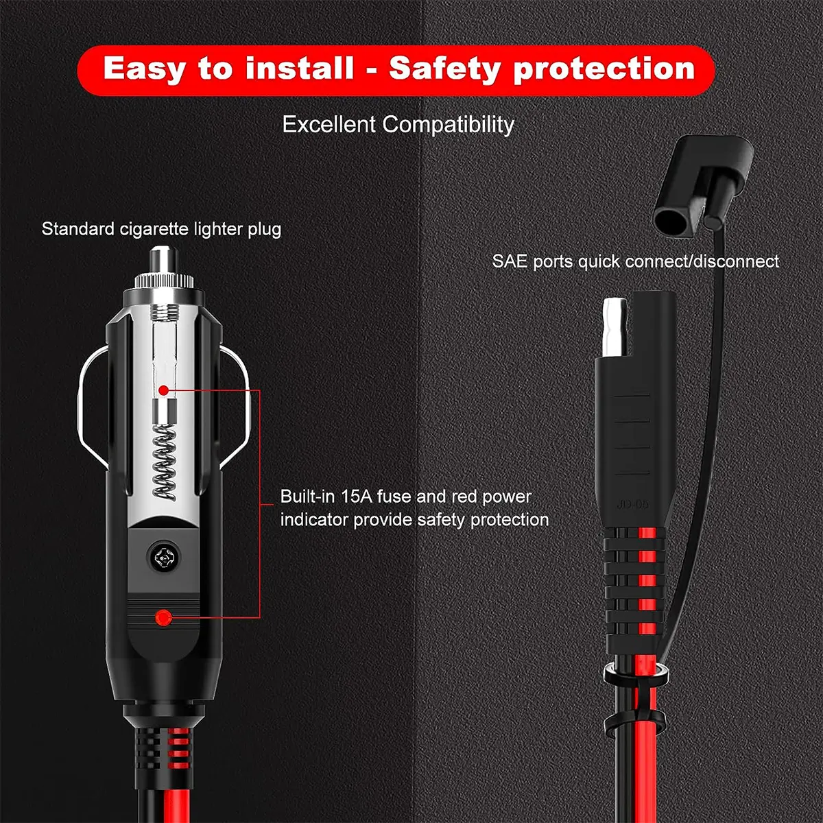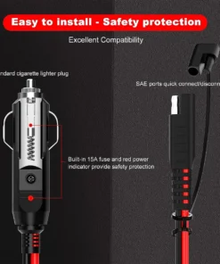4. Safety Protection – Equipped 15Amp built-in fuse for overload and shortcircuit protection. Red power indicator light, when cigarette lighter male plug is connected to the power, the light will brighten, that’s easy to check the connection status.