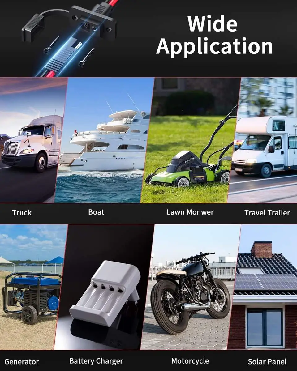 4. Wide Application – Easily and quickly connect or disconnect battery packs to different vehicles. They are widely used in solar panels, motorcycles, lawn motors, tractor batteries, trucks, RVs, DIY, etc.
