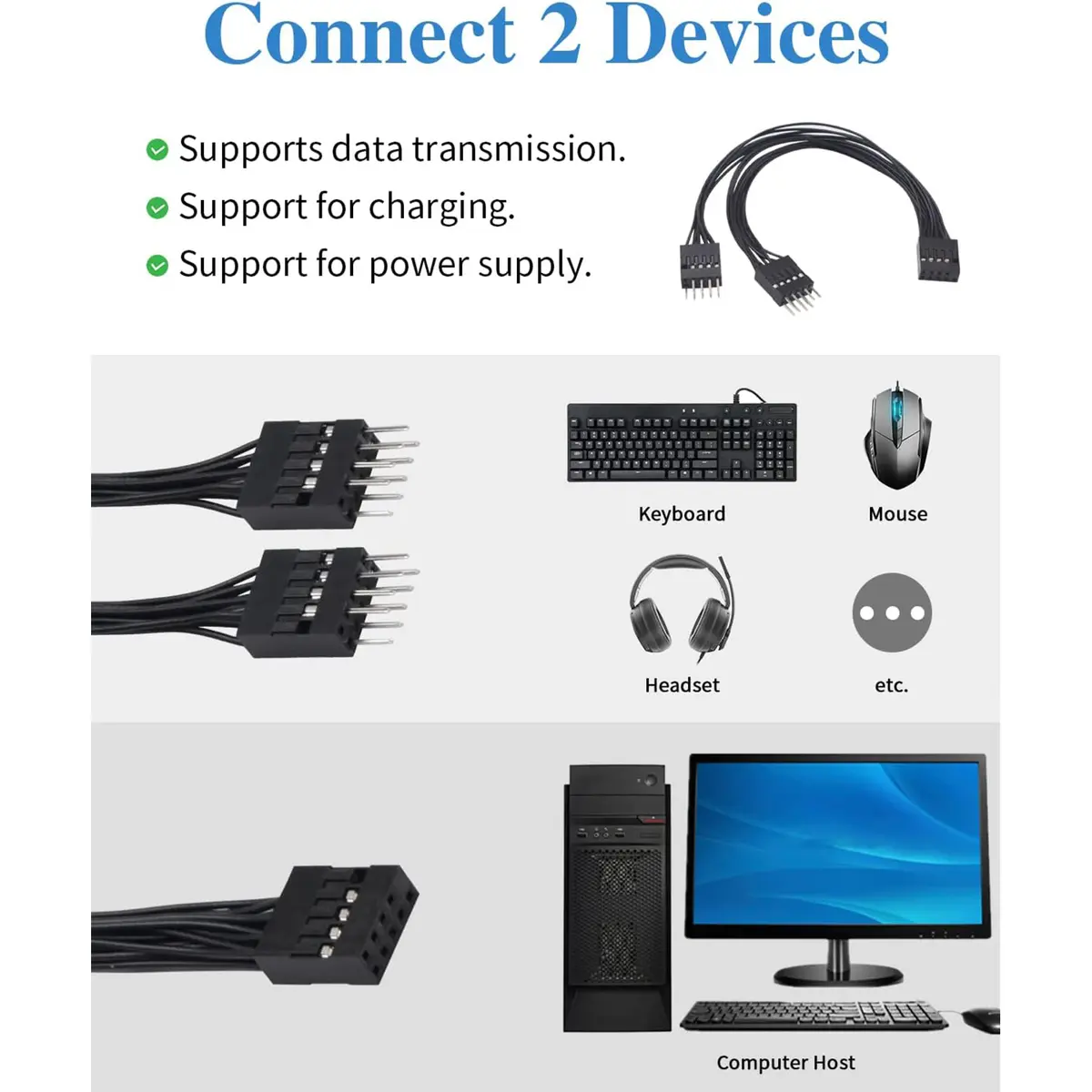 2. Important Note: The two 9-pin ports cannot transmit data simultaneously. If the motherboard’s USB 9-pin is converted into two 2-pin ports, they are only used for power supply purposes, such as for fans or LED lights. Additionally, if the motherboard’s USB 9-pin is converted into two 9-pin ports, one can provide power while the other supports data transmission