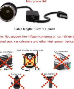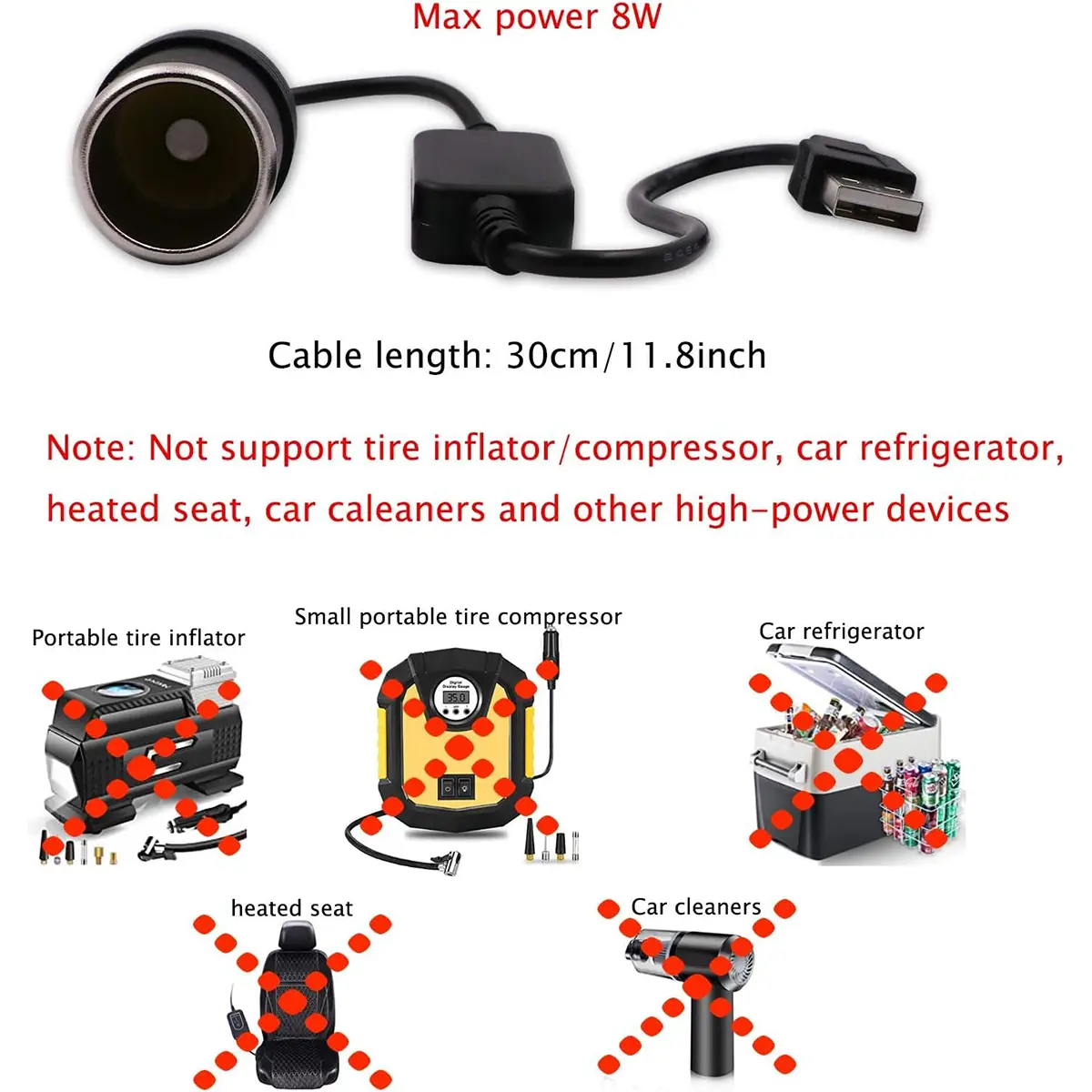 1. This USB to 12v cigarette lighter socket output 12v 8w Max. (It’s not support some high power electric device,such as tire inflator, air compressor, car cleaner, car refrigerator and more)