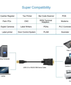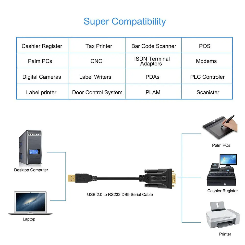 USB to RS232 adapter works with modems, ISDN Terminal Adapters, digital cameras, label writers, palm PCs, PDAs, cashier register, CNC, PLC controller, tax printer, POS, bar code scanner, label printer, etc.
